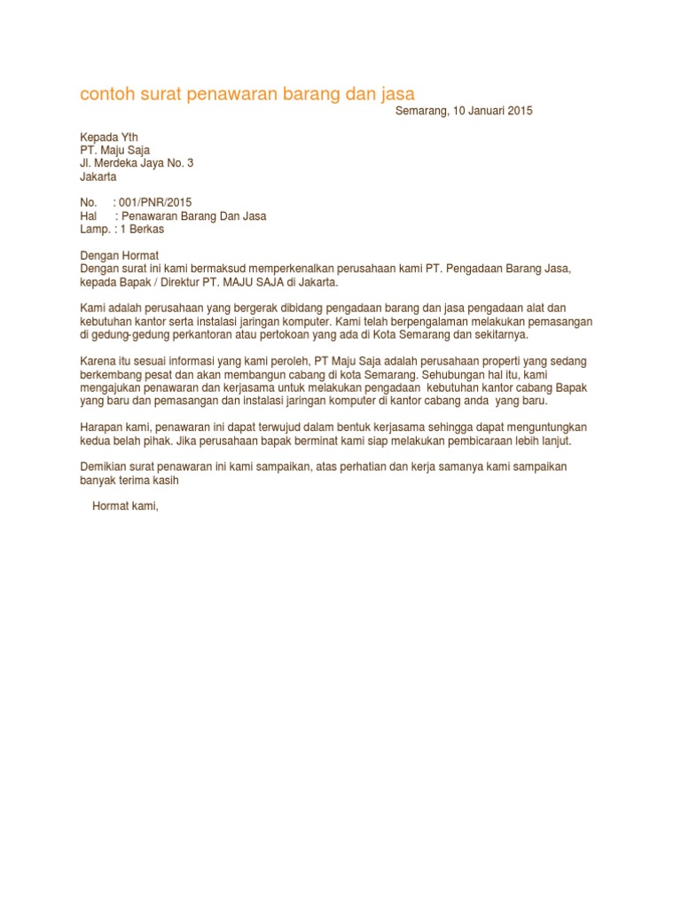 Contoh surat pesanan ini dapat digunakan untuk kamu perorangan ataupun perusahaan. Terkait dengan itu, kami ingin menawarkan beberapa produk alat serta perlengkapan komputer terbaik yang dapat mendukung operasional pt. Surat penawaran barang adalah surat yang sering dipergunakan untuk tujuan menawarkan barang serta jasa dengan kerjasama terhadap perusahaan yang. Disamping memiliki pengaruh yang baik untuk membuat jenis usaha kita dapat laris dan laku dipasaran. Contoh surat penawaran barang yang baik dan benar. Walaupun tingkat kebutuhan masyarakat akan barang tersebut tinggi, namun persaingan bisa saja membuat penjualan terasa sulit. Anda bisa menyimak contoh surat penawaran barang berikut ini terlebih dahulu. Berikut ini contoh surat penawaran barang yang diterbitkan oleh perusahaan dengan tujuan menjain kerjasama yang saling menguntungkan. Surat penawaran termasuk salah satu contoh surat resmi. Surat penawaran ini diharapkan menjadi awal mula atau pembuka kerjasama antara pihak perusahaan dengan klien atau perusahaan lain. Banyak orang yang berfikir jika. Jenis surat penawaran ini seringkali dikeluarkan oleh perusahaan penghasil produk untuk ditujkan kepada pihak distributor atau langsung ke masyarakat sebagai konsumen. Surat penawaran merupakan surat yang dibuat oleh penjual kepada calon pembeli yang berisi mengenai informasi barang atau jasa yang akan dijual kepada calon pembeli.