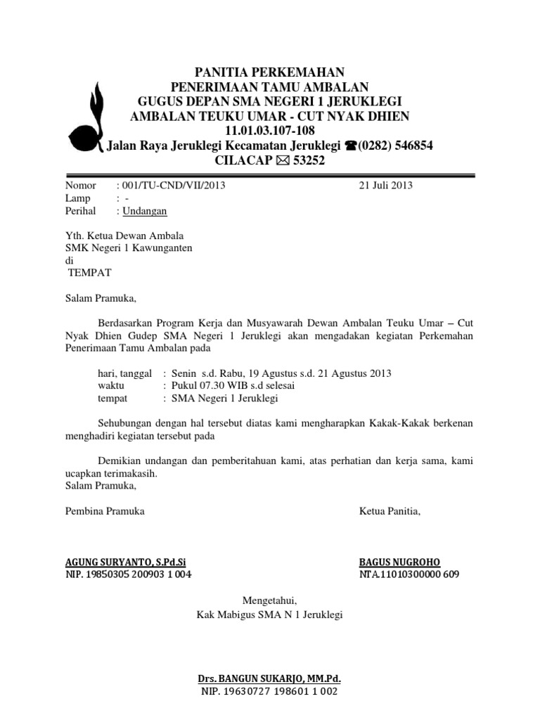 Contoh Surat Undangan Gerakan Pramuka Contoh Surat from imgv2-1-f.scribdassets.com Download contoh surat undangan karang taruna.docx. Contoh surat undangan rapat warga dilingkup rt dan rw. Selanjutnya akan diberikan contoh surat undangan resmi organisasi pramuka sebagai berikut. Gerakan pramuka gugus depan xix jalan gelora agung no.54 bandar lampung 31568 telp : Surat undangan adalah surat yang dibuat dengan tujuan mengajak seseorang atau pihak lain untuk menghadiri sebuah acara tertentu. Surat keterangan kerja untuk visa. Berikut ini contoh surat keterangan kerja word dalam bahasa inggris yang dapat anda pergunakan. Surat resmi biasanya digunakan untuk tujuan yang resmi, sementara surat tidak.